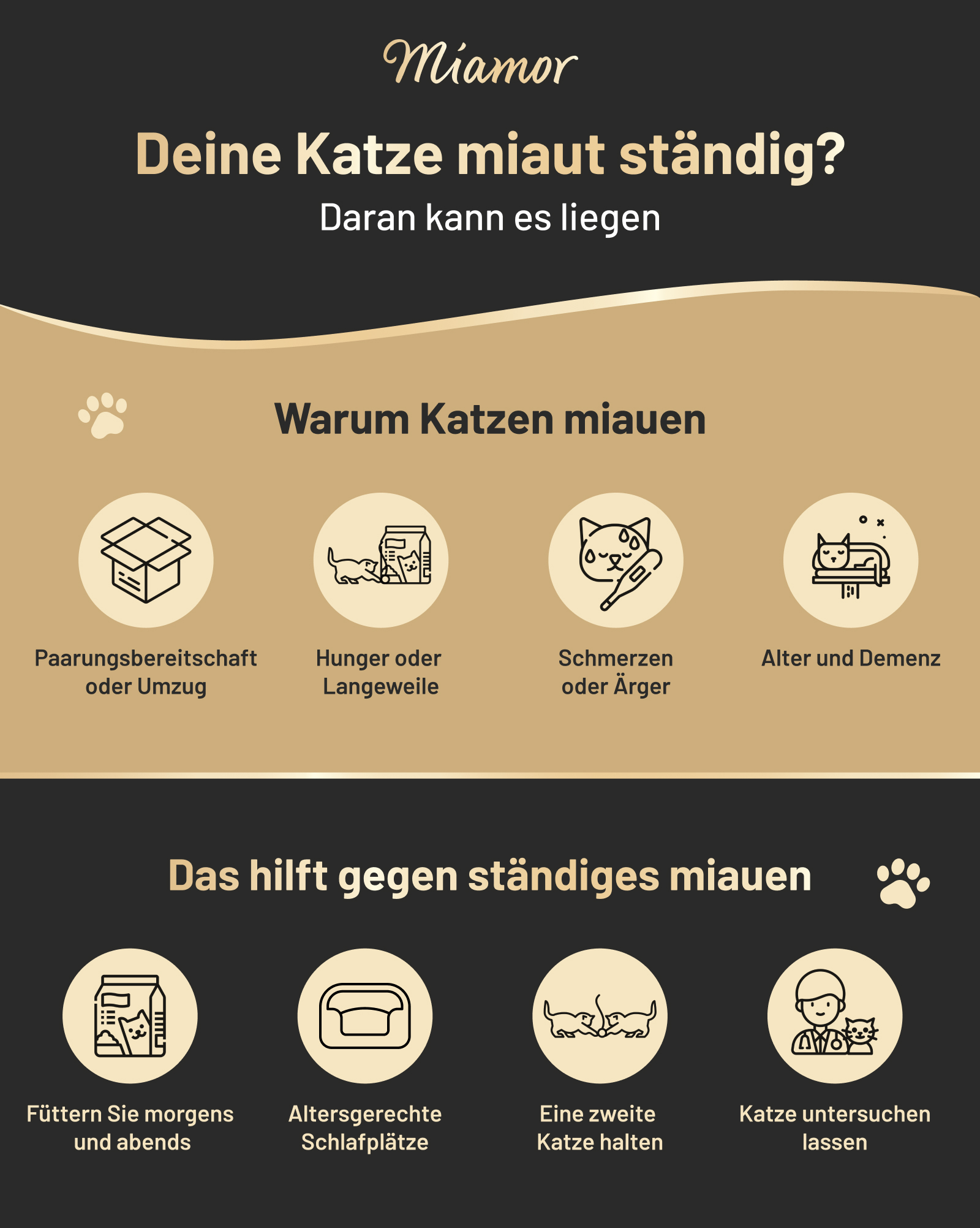 - Alter und Demenz: Bei alten Katzen lässt das Gehör oft nach und manchmal sogar dement und beginnen dann auch verstärkt zu miauen.